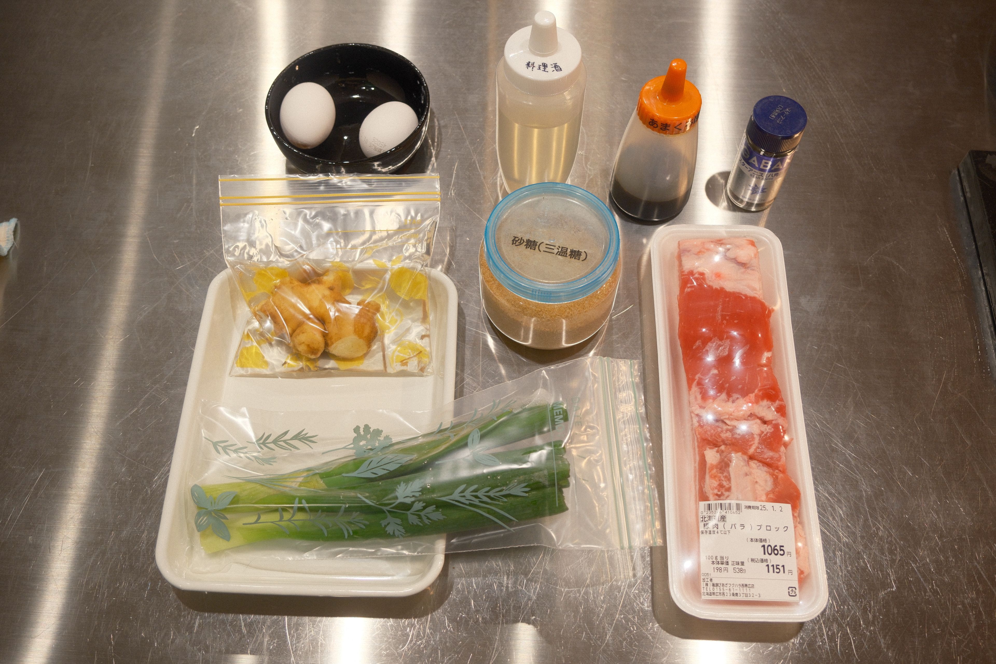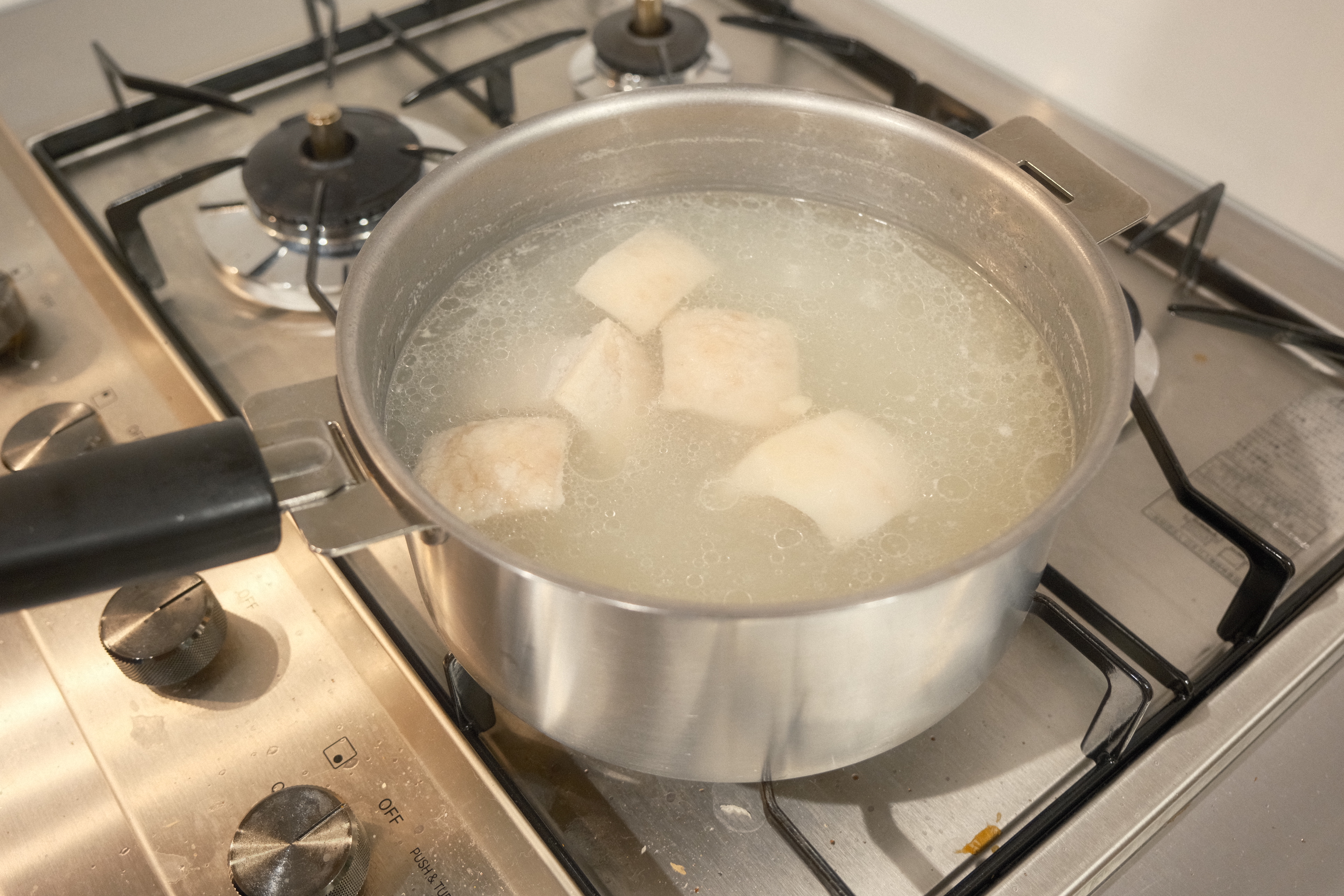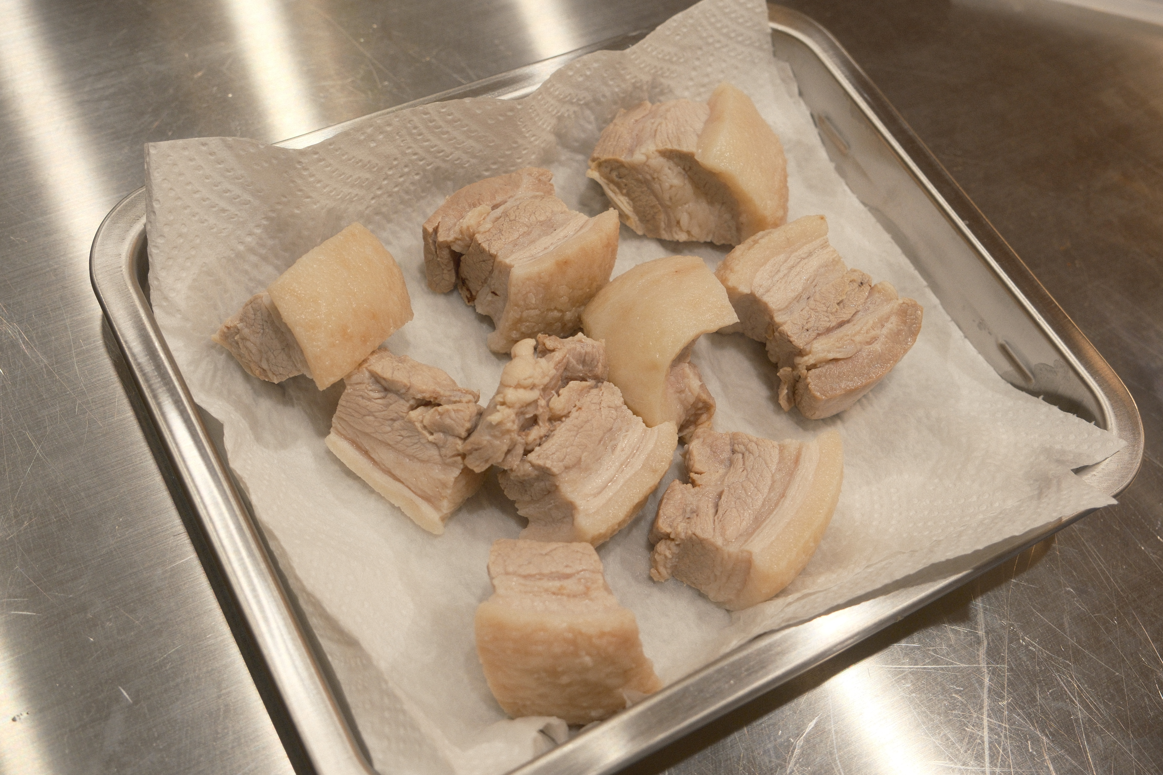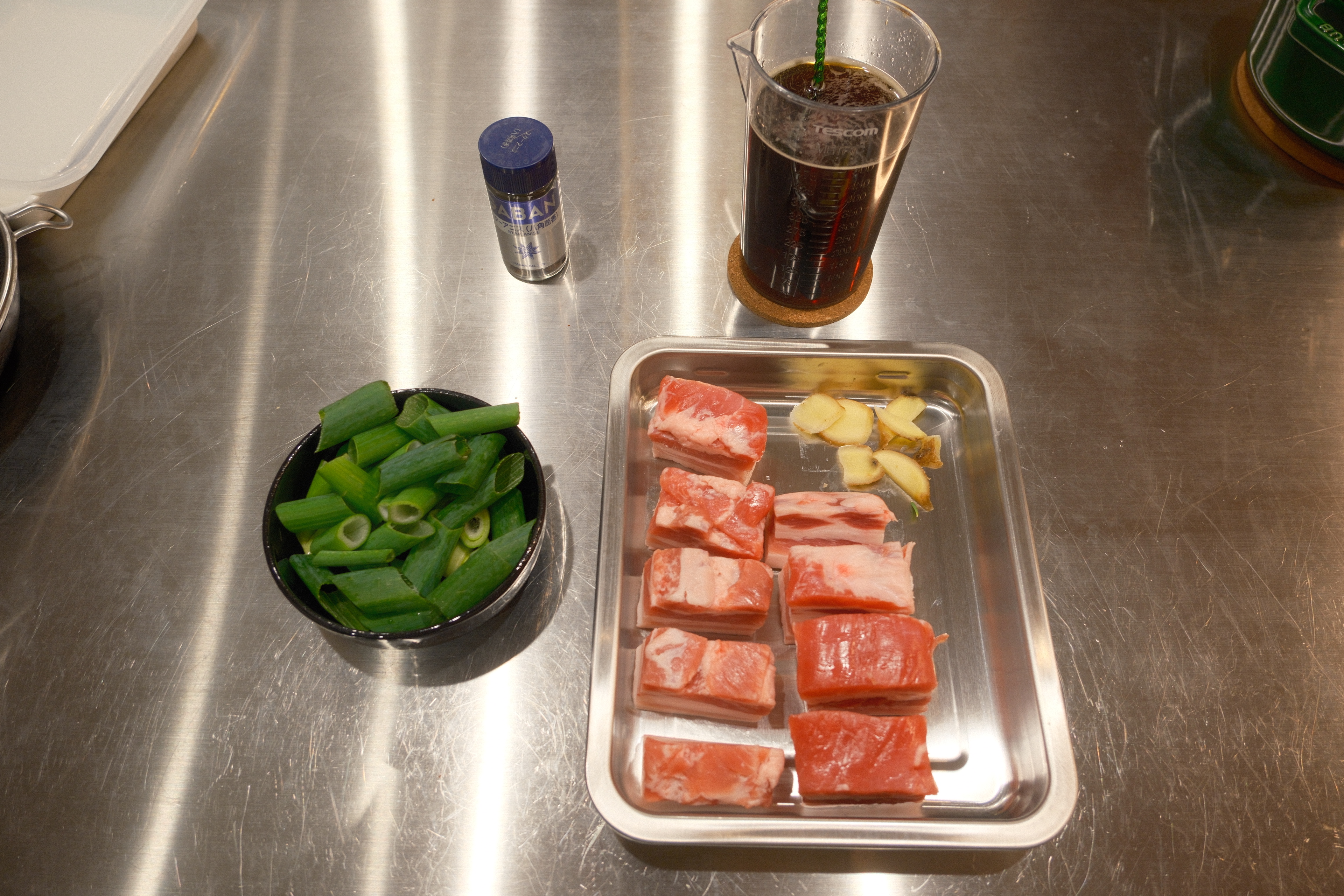豚バラは4cm幅に切る。 米のとぎ汁(できれば濃いもの)を用意し、その中で豚バラをゆでる。