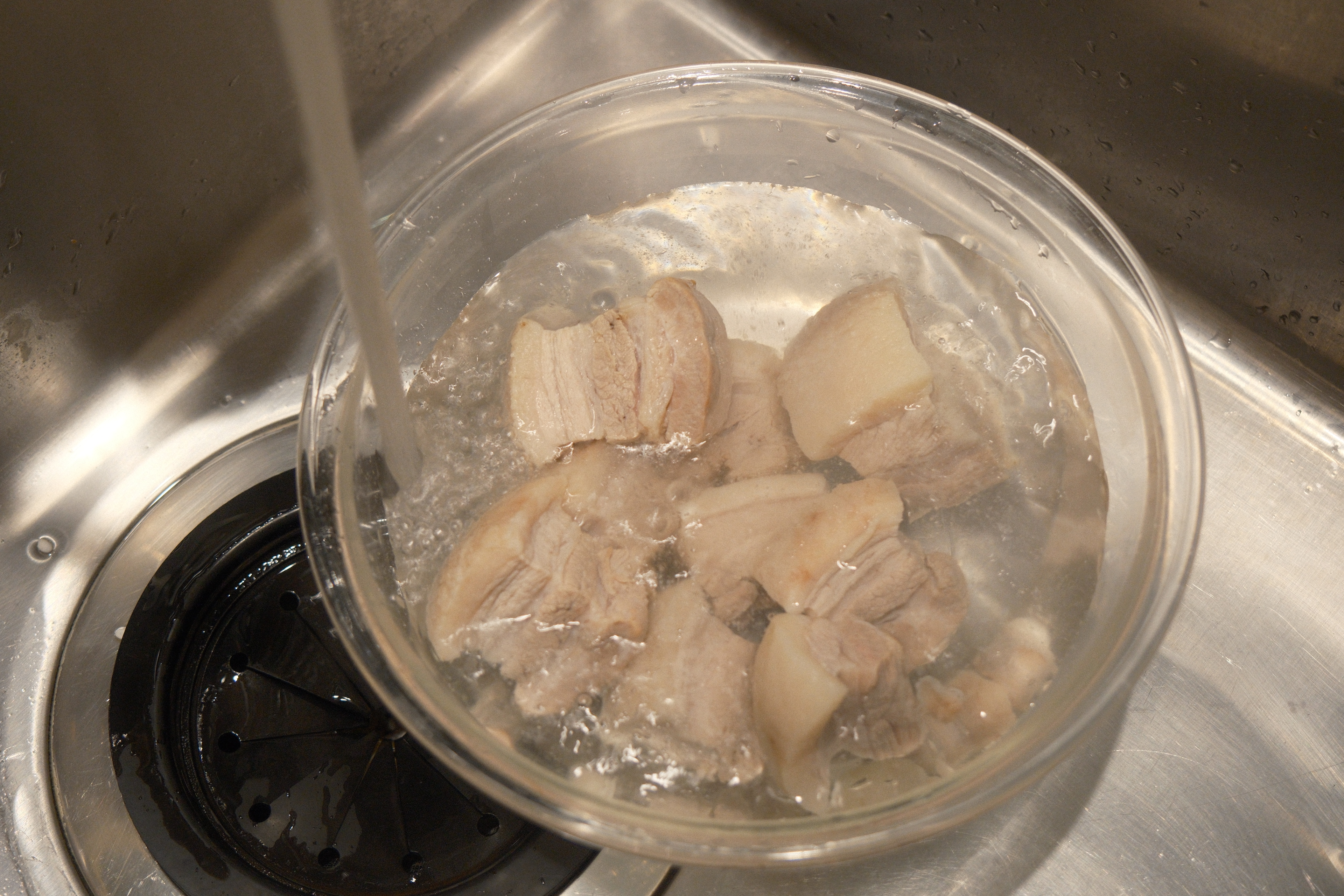 冷ました豚肉を鍋から取り出し、水で洗い表面の余分な脂や汚れを落とす。
