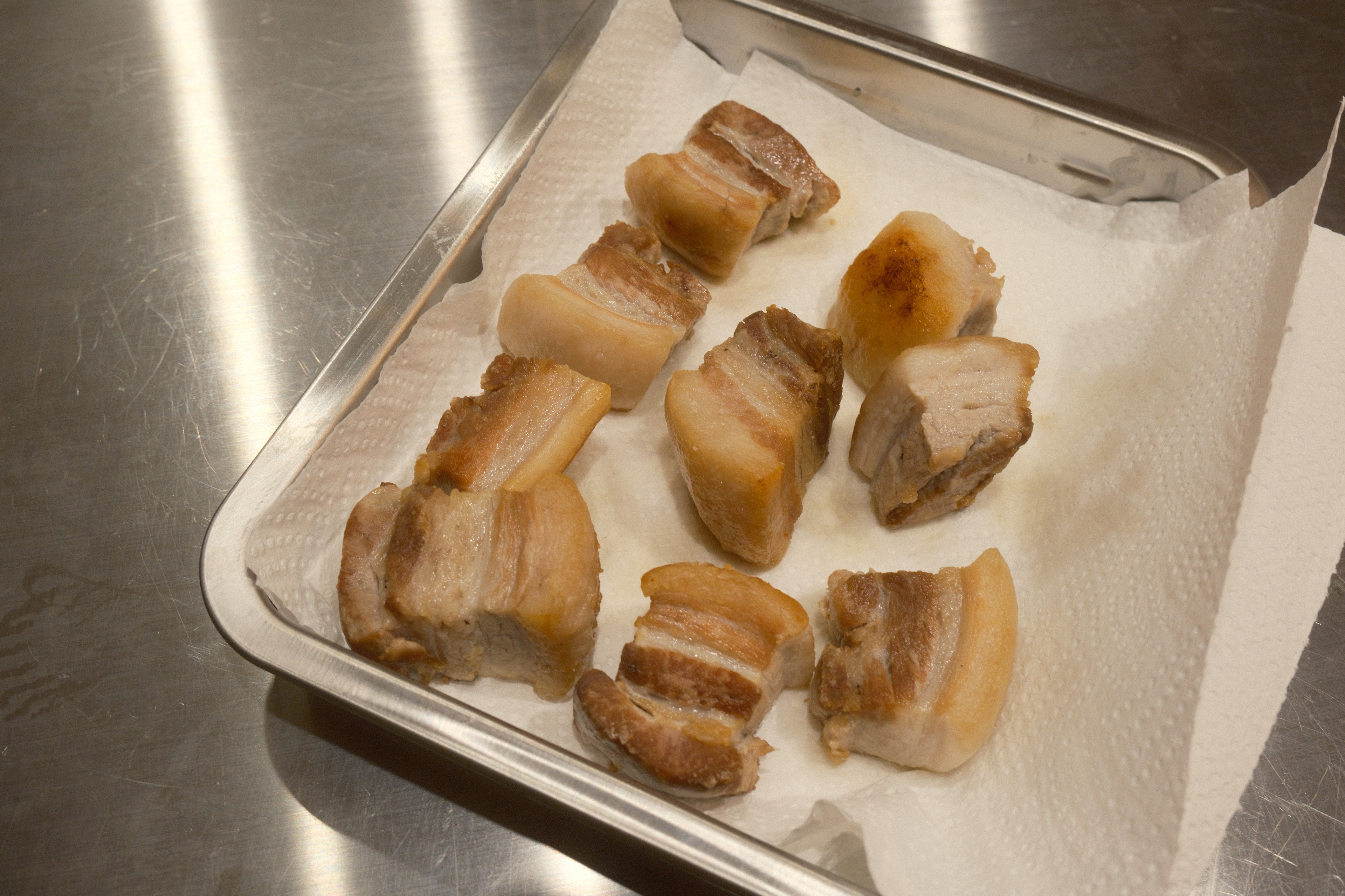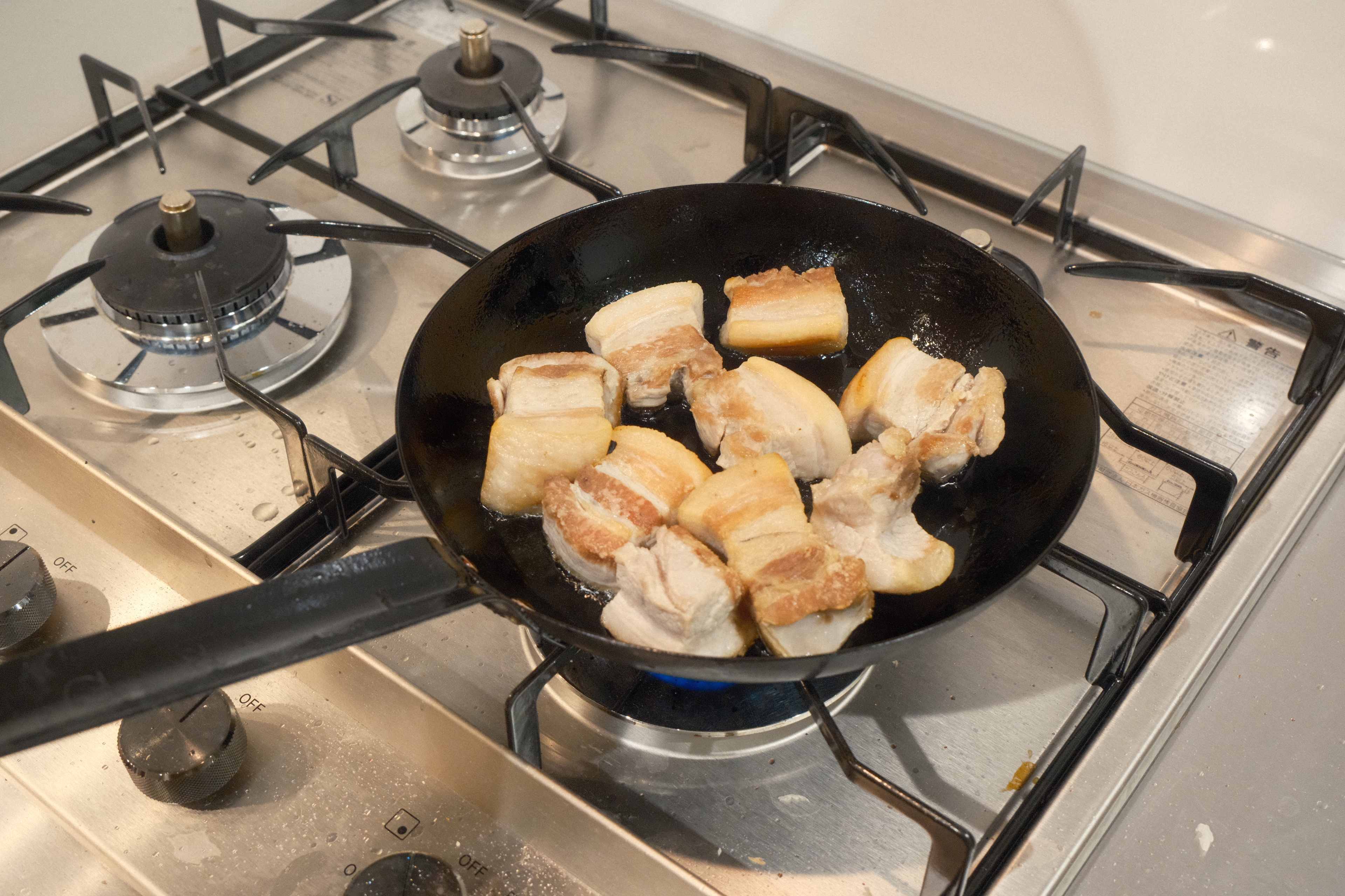 キッチンペーパーなどで水分をしっかり拭き取る。 フライパンに油をひかず、中火で豚バラの表面を焼く。表面がカリッとなるまで焼き、焼き終わったら出てきた脂をキッチンペーパーで拭き取る。
