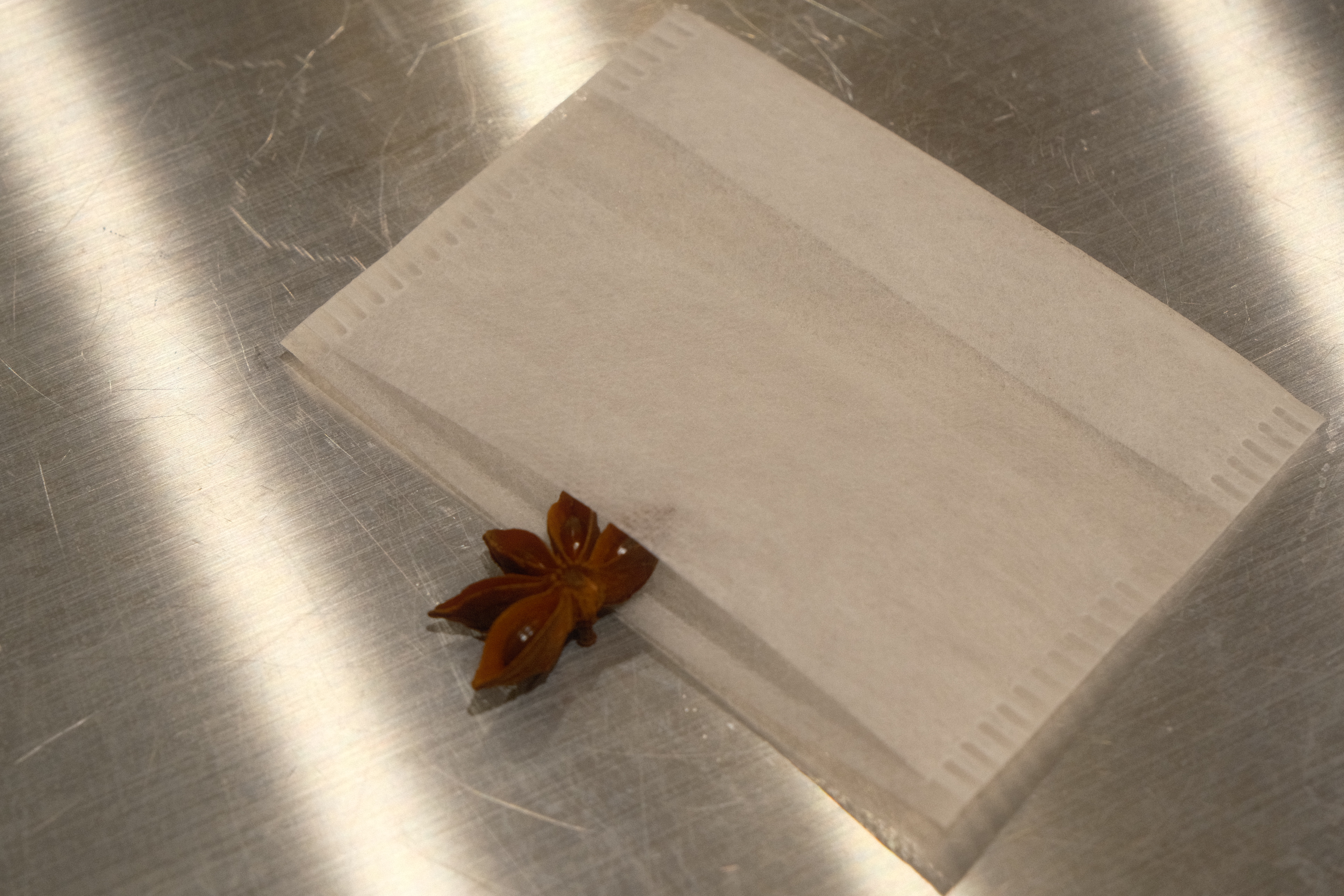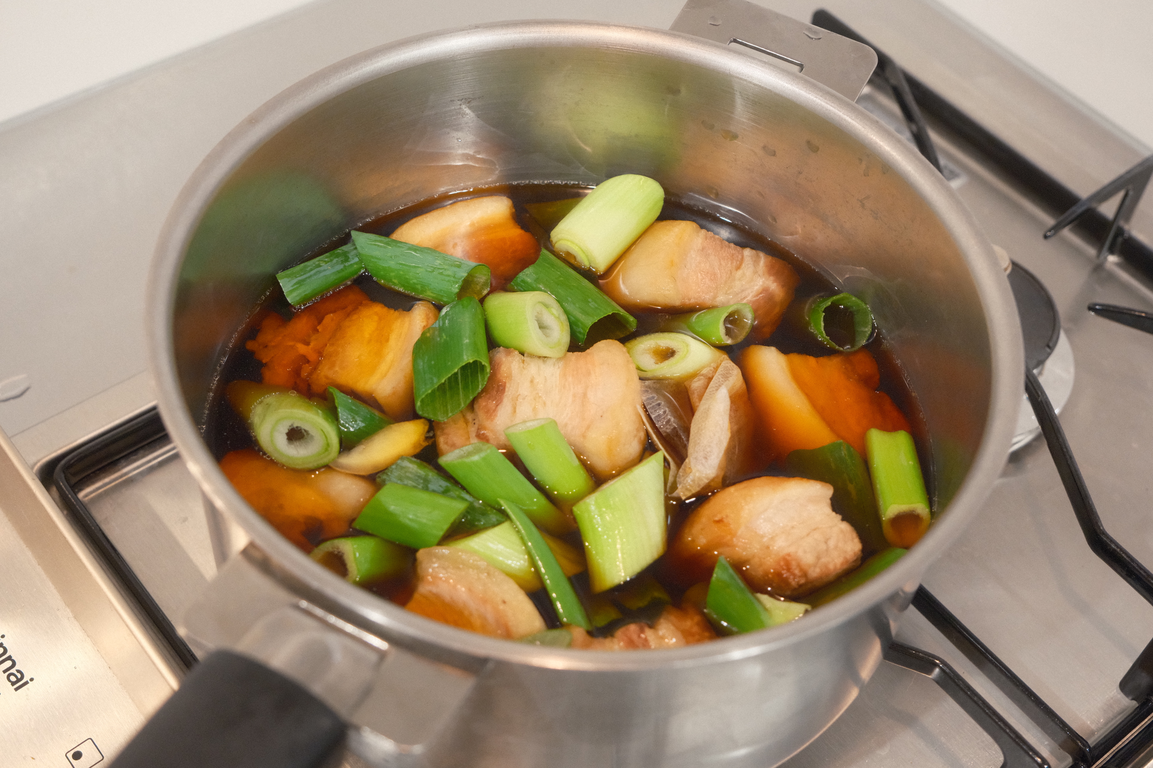 鍋(Staubなど)に、焼いた豚バラ、生姜、長ネギ、八角を茶パックなどに入れて加える。 Aの調味料(水、醤油、酒、砂糖)をすべて鍋に加え、中火にかける。