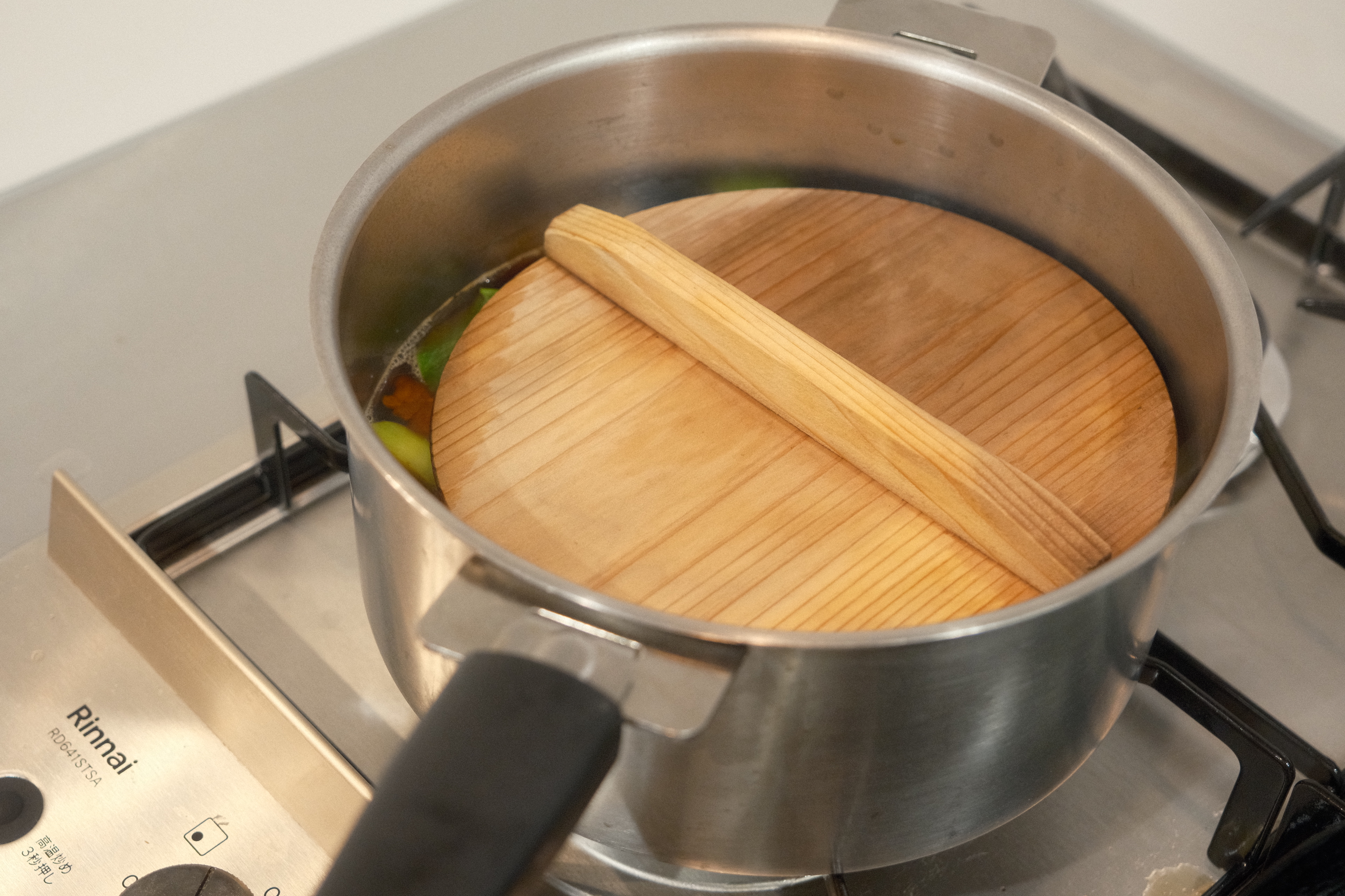 ※蓋を完全に閉じると煮汁が濁る可能性があるため、少しずらして蒸気を逃がす。
