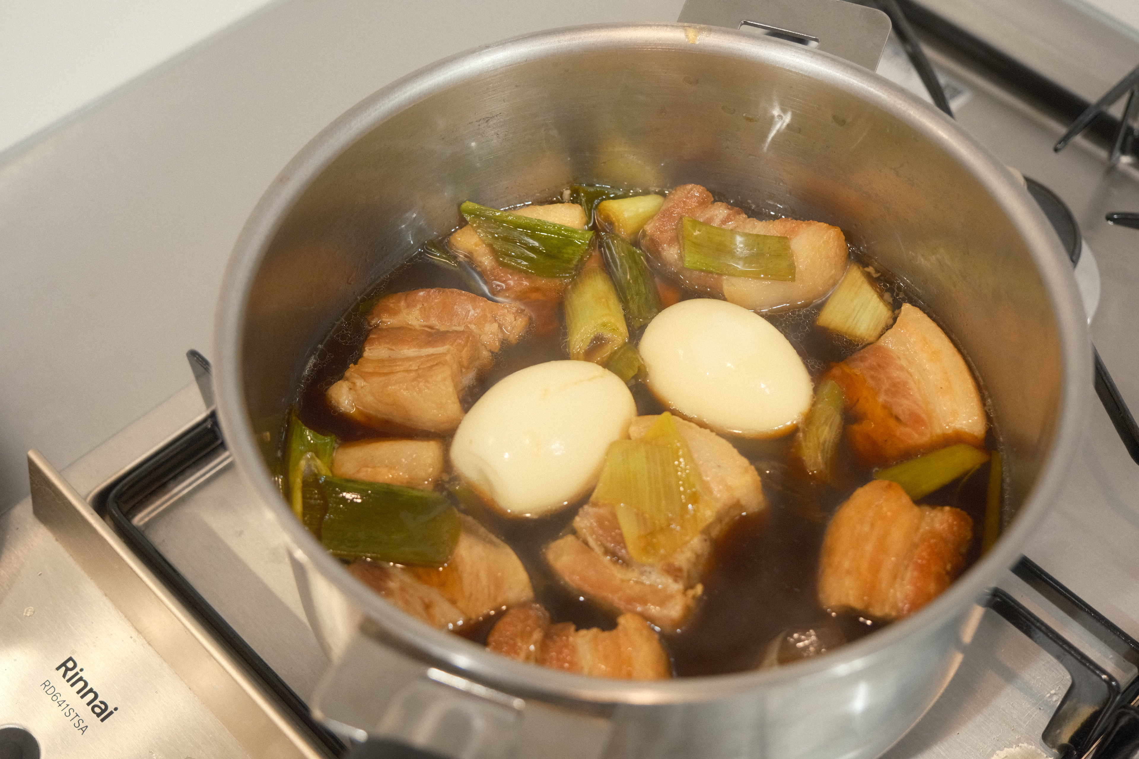 煮汁が少なくなったら、落とし蓋を外し、ゆで卵を鍋に入れる。さらに10~15分間、煮汁が絡むように煮詰める。